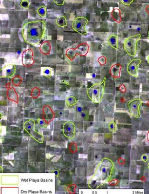 Another of the primary threats facing the ecological integrity of playa lakes is the practice of row cropping to the edge of and often directly through these sensitive wetlands. The practice of not observing grassland buffers dramatically increases playas' susceptibility to filling by sedimentation. The PLJV GIS aids planners in characterizing playas' threat status by their associated land use.