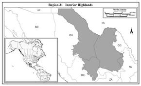 The Interior Highlands (Northern and Central) Region of Mexico (Region 31*) consists of the Mexican Plateau which slopes gradually from less than, 1000 m in the north to 1,500-2,000 m in the south (Leopold 1959). This plateau includes 5 of the physiographic regions outlined by Leopold (1959): Sierra Madre Occidental, Central (Northern) Plateau, Sierra Madre Oriental, Bajio and Volcanic Cordillera. The first three of these areas, which comprise the northern 2/3 of the Mexican Plateau, are combined here as the Northern Highlands. The remaining two, which comprise the southern 1/3 of the Mexican Plateau, are combined as the Central Highlands.