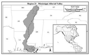 The Mississippi Alluvial Valley (Region 21*) is the historic floodplain of the Mississippi River formed by melt water as glaciers receded approximately 12,000 years ago. The MAV is approximately 800 km long and covers portions of 7 states from southern Illinois to Louisiana.