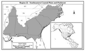 The Southeastern Coastal Plain (Region 22*) extends from the James River in Virginia, southward to approximately Jacksonville, Florida, westward through south central Georgia and Alabama, through roughly the eastern half of Mississippi, and then northward into extreme western Tennessee and Kentucky. It is located between the Piedmont to the north, and the Atlantic Ocean to the east. The western side of this conservation area is bordered by the MAV, while in Florida; it covers the northern portion above the Peninsular Florida Conservation Region. The southern border is the Gulf of Mexico. Geographically, this conservation region covers a large portion of the extreme southeastern U.S., including portions of two separate NAWMP joint ventures – the Atlantic Coast JV (Virginia, North Carolina, South Carolina, Georgia, and Florida only) and the Gulf Coast JV (coastal Alabama and Mississippi only).