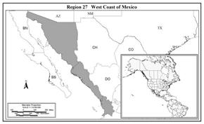 The mainland west coast of Mexico (Region 27*) contains several important areas for waterfowl. These habitats consist of tidal estuaries connected with brackish water marshes along the coast and inland fresh water wetlands and reservoirs. Fresh water streams and irrigation water empty into tidal lagoons and create flats, tidal pools, mangrove swamps and emergent vegetation dominated by cattail, bulrush, wigeongrass, muskgrass and algae.
