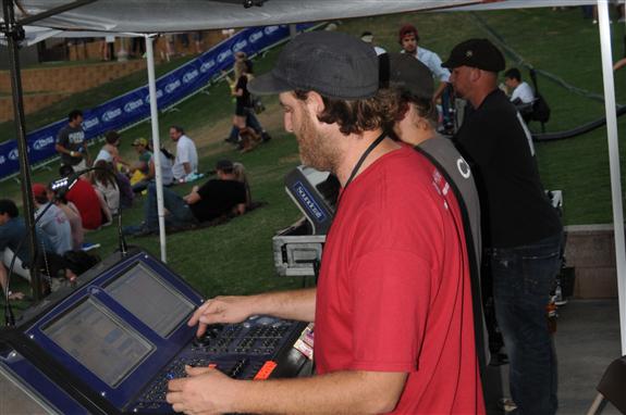 Tony Schwemberg adjusts the main stage lights for the 2011 Duck Jam in College Station, TX. The two-day event features several bands and activities for event-goers of all ages.