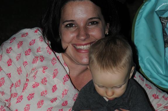Mary Elyn Worsham, Mansfield, TX, holds her six-month-old son Will during the first night of the 2011 Duck Jam in College Station, TX. She said her family came because her husband wanted to see the retriever display scheduled for Saturday at the event. Several thousand music fans attended the first night's performances.