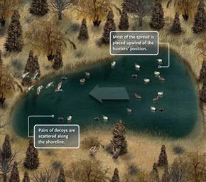 Burnam sets half of his spread in a group well off the bank, with the wind at his back whenever possible. However, if the wind is blowing at a quartering angle, he moves this group of decoys slightly upwind of his shooting position. In both cases, he sets his decoys with lots of space between them so they appear to be birds resting in comfort and security.