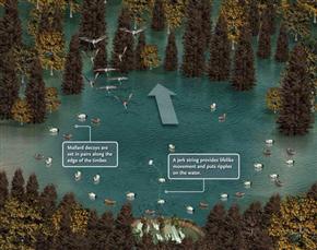 "We also splash and kick the water while ducks are working, so we always set a few decoys close to where we're hiding. We prefer standing in shallow water next to trees on the upwind edge of the hole. When the water is too deep to stand in, we hunt from a boat, which we hide in thick brush or under overhanging limbs," he says.