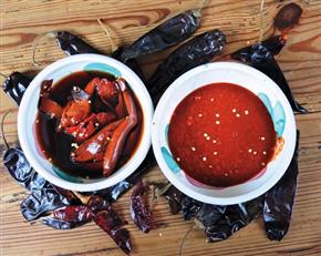 - Place chilies in a small saucepan with 2 1/2 cups of water. Bring to a boil, remove from heat, and steep for 30 minutes. Place softened chilies and about 1/2 cup of the steeping liquid in a food processor or blender. Purée until smooth, adding more liquid if necessary. Pass mixture through a strainer to remove seeds and any bits of skin.