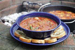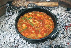 To prepare this recipe using a slow cooker: First brown the meat and add the remaining ingredients, reducing the stock by one-half. Cook on medium-low for 4 to 5 hours or until the meat is tender. This recipe can also be prepared in a dutch oven over white-hot coals. Serve with croutons or crusty bread.