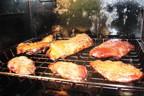 You'll find that most smokers have hot spots or areas that cook faster than others. For that reason, it's best to rotate the racks about halfway through the cooking process so the duck meat is cooked more evenly. Of course, given the inconsistencies within most smokers, rarely will the different meats be finished at precisely the same time. In other words, when each piece is done, take it out. If it's not done, leave it in until it is done.