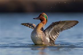If a small duck without conspicuous wing colors flies by, it’s probably this species. From below, flying drakes show a light belly. The flight is fast, buzzy and erratic, usually low, with compact flocks wheeling in unison.