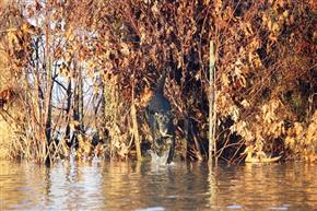 Next we covered the panels over the shooting holes with pieces of camo netting and small oak and willow limbs, which we also zip-tied to the hog wire. When these panels are up, hunters can look through them and watch ducks work without being seen. (When it's time to shoot, everybody knows where the ducks are.) We camouflaged the retriever platform and ramp by creating a hog wire tunnel, which we covered with brush fastened to the wire with zip ties. This camo tunnel conceals everything but Andy's head as he watches for ducks.