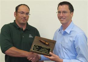 NEW ULM, Minn. August 8, 2011— Ducks Unlimited recently recognized Benjamin J. Schaefer, realty specialist with the Minnesota Department of Natural Resources Division of Lands and Minerals, with a "Beyond the Call" award. Josh Kavanagh, DU biologist, presented the award to Schaefer at a southern regional wildlife staff meeting in New Ulm, Minn., where Schaefer is located.